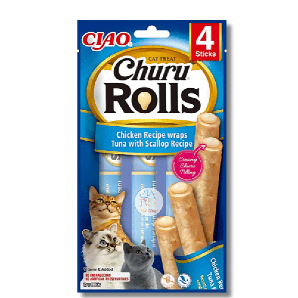 تشورو رولز مكافآت رقائق الدجاج مع حشوة كريمية بنكهة التونا والمحار للقطط – 4 أظرف