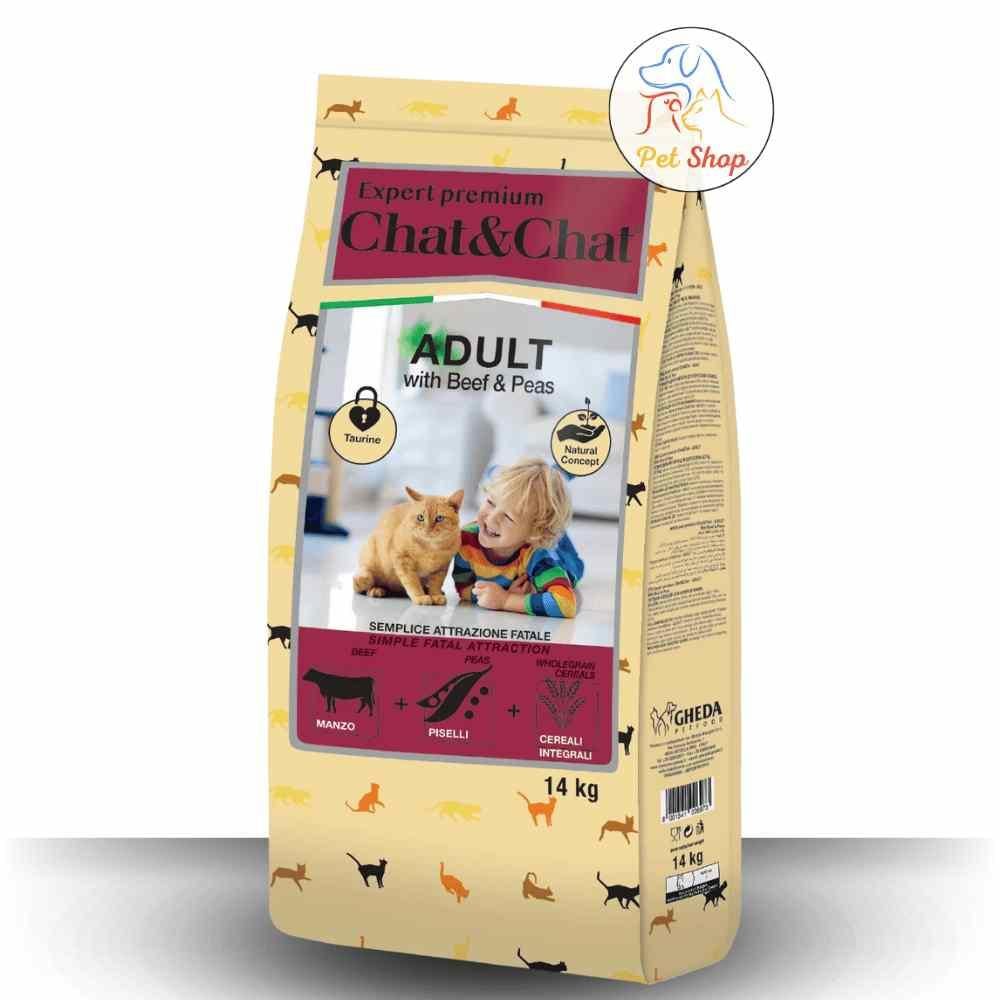 Chat&Chat Expert Beef&Peas 14Kg - Complete food for adult cats. Composition: Cereals (whole grains 24%), Meat and animal derivatives (beef 10%), Vegetable derivatives (dried beet pulp 1%), Oils and fats, Fish and fish derivatives, Vegetables (dried peas 0.2%). Nutritional additives: Vitamin A 12,000 IU, Vitamin D3 900 IU, Vitamin E 100 IU, Taurine 675 mg, Copper sulphate pentahydrate 8.75 mg, Zinc oxide 50 mg, Iron(II) carbonate 87.5 mg, Calcium iodide anhydrous 1.00 mg, Manganese oxide 17.50 mg, Sodium selenite 0.13 mg. Technological additives: Antioxidants (EC). Analytical components: Crude protein 31.00%, Crude fiber 3.00%, Crude oils and fats 12.00%, Crude ash 9.50% Directions for use: Measure the appropriate amount of "Adult Cat & Kitten" meal with beef and peas. Serve dry or add to hot water. Keep a bowl of cold water available. Store in a cool, dry place. Manufacturer & Country