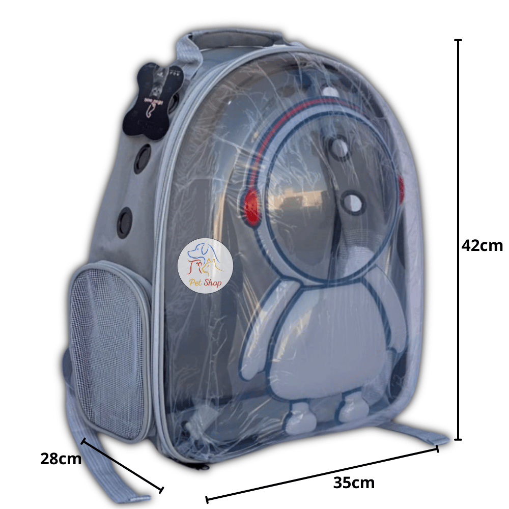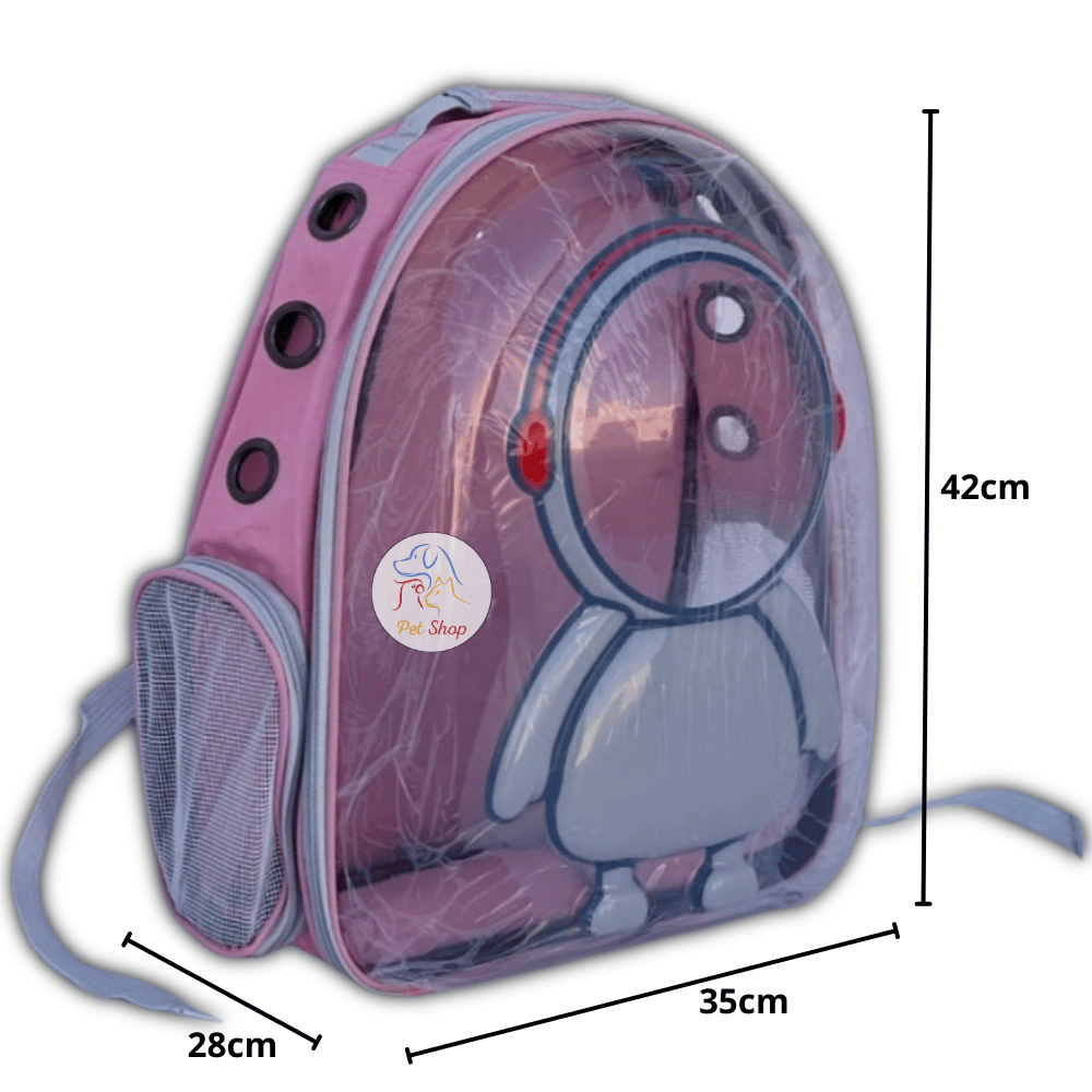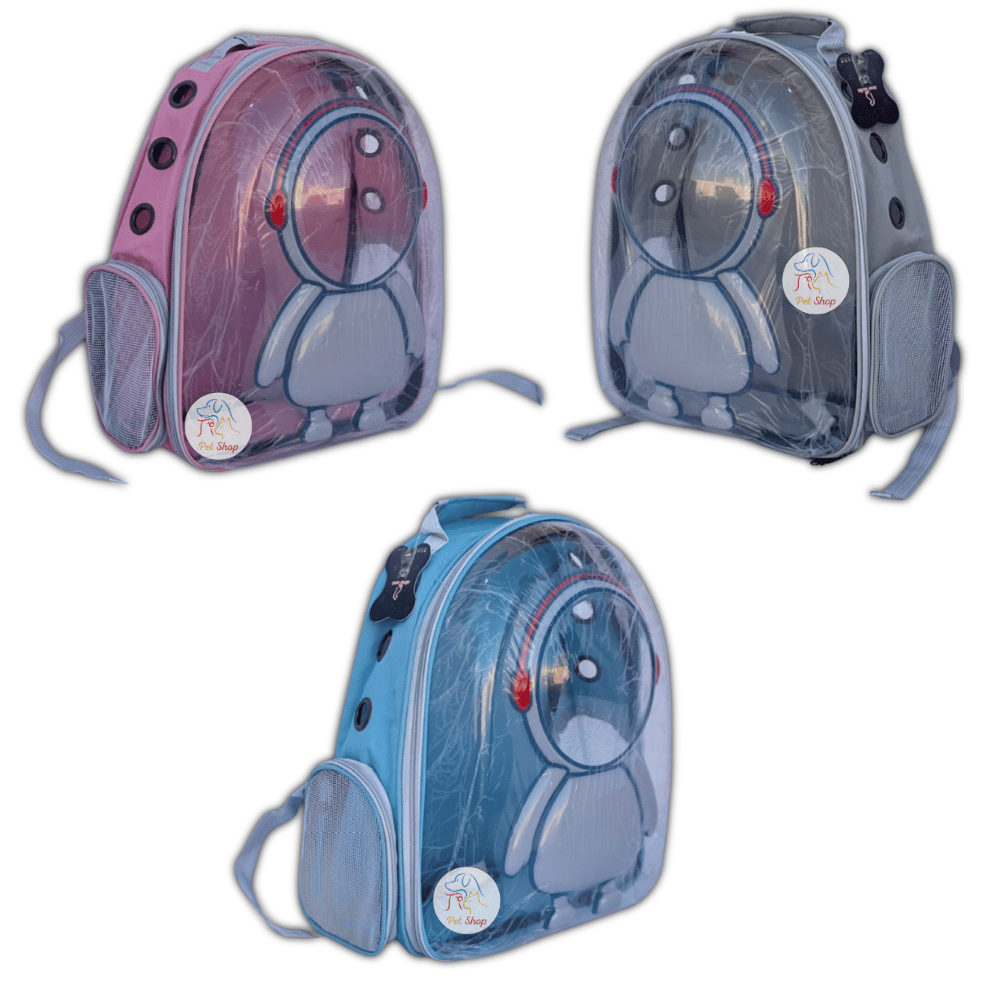 A clear backpack with a distinctive design for easy and safe transportation of pets. The bag features a modern and attractive robot-like appearance and is available in three stylish colors: pink, blue, and gray. The bag is designed with thoughtful dimensions (42 cm high x 35 cm wide x 28 cm deep), providing the perfect space for small animals such as cats and small dogs.